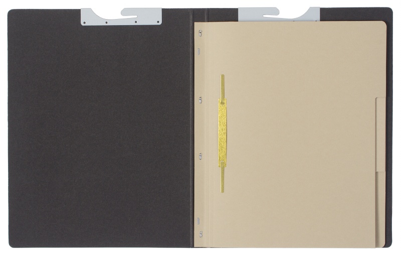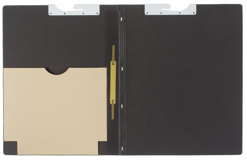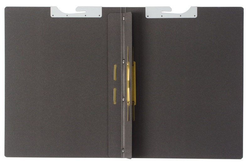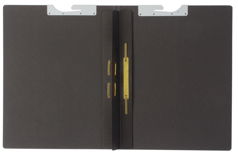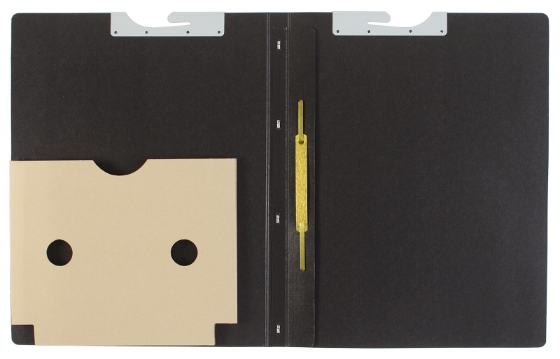 - 3 dividing sheets made of 250gsm grey cardboard with unprinted tabs stapled into spine, metal fitting on each tab; right-hand fitting