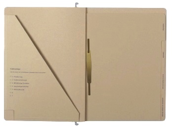 - Vertical, straight pocket in rear cover, 165mm long, closed with 4cm-long black linen strips at top and bottom of file