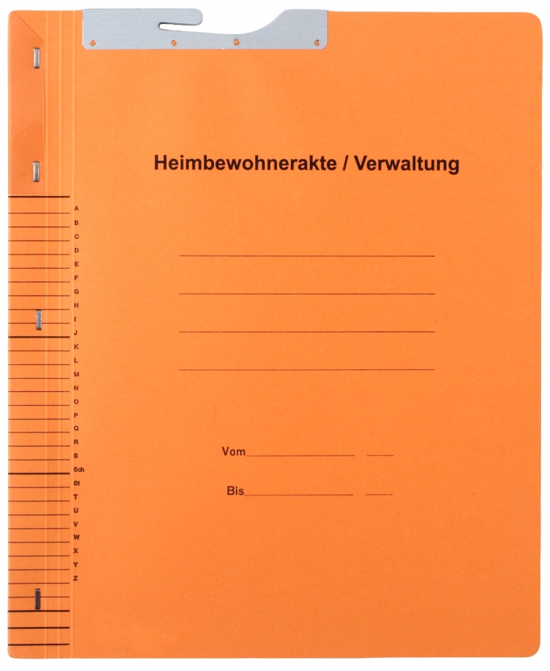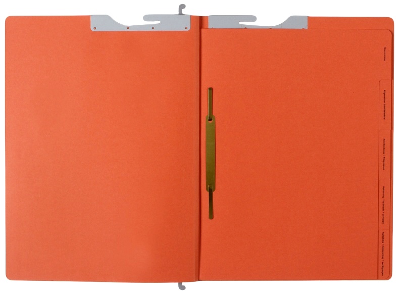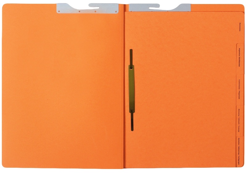 - 5 dividing sheets made of 250gsm orange cardboard with printed tabs wirestitched into spine, all tabs with metal fitting; right-hand fitting
