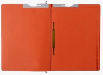 - Five 250gsm orange cardboard dividing sheets with printed tabs wirestitched into spine; metal fitting on each tab; right-hand fitting