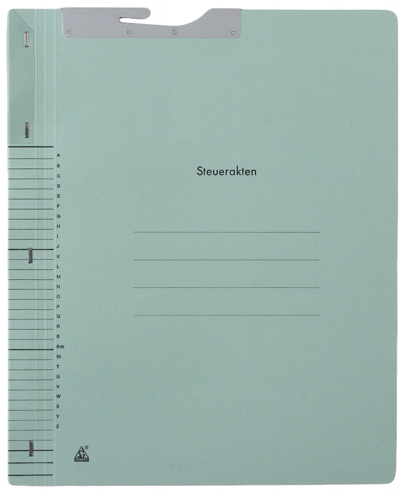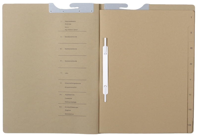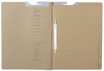 - 8 dividing sheets with printed tabs wirestitched into spine; each tab with plastic-coated fastening strip without cap and plastic cover strip; right-hand fitting