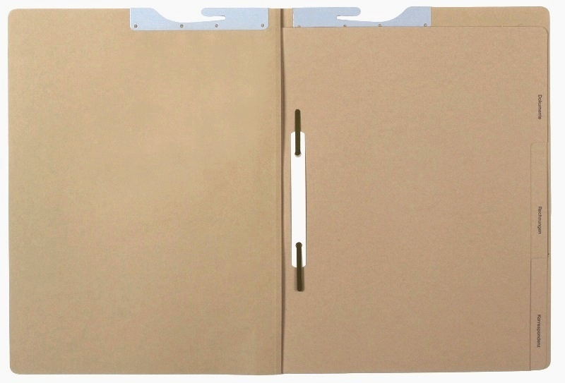 - Four 250gsm grey cardboard dividing sheets with printed tabs wirestitched into spine; metal fitting on each sheet; right-hand fitting